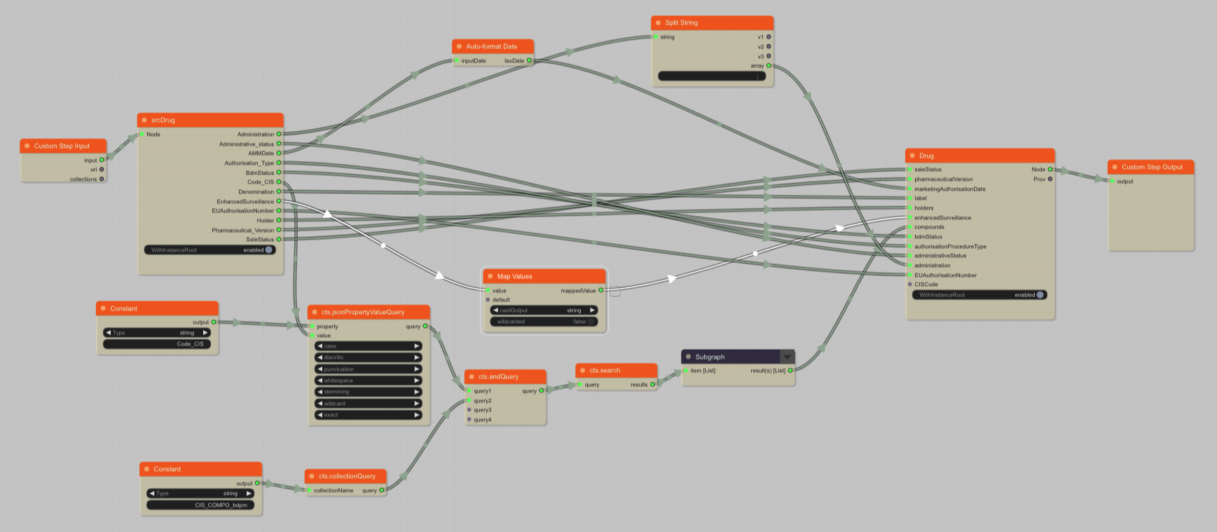 Pipes has mainly high level blocks but can also perform low level queries. In this exemple we create a MarkLogic "cts" query that will search for compounds (in the source compound collection) that match the current drug we are processing. The drug (CIS code) identifier in provided to the jsonPropertyValueQuery block as value. Then the cts.search block execute the query and returns a list of matching source compound documents.